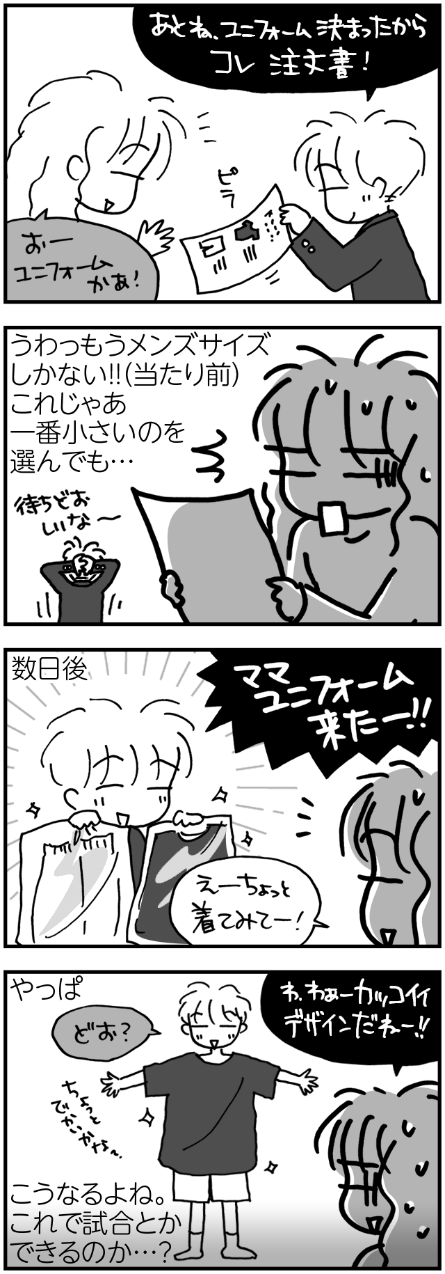 カッコいいユニフォーム【テニ厨/Game.519】 2024年01月03日 カテゴリ:ずうの生態中学生・部活時代〈一年〉 制服を採寸した時嫌というほど思い知らされたはずなのにやっぱり140とか150という表示を探してしまう。S、M、Lとあっても一瞬「子供用のS、M、Lかな?」なんて。しかしこれは紛れもなくメンズ。メンズのSなんて母が着たって大きいのにどうすんだい。以前ジョコたんがウェアはタイトな方が好きなので特別にあつらえていると聞いたことがある。きっとそれも最高のパフォーマンスのために必要なことなのであろう。そんな話を踏まえて見るとムササビのようなこのユニフォームは風の抵抗を受けまくってパフォーマンスダダ落ちになること間違いなしではないだろうか。早くユニフォームに追いつけ、ずう。orz制服採寸のお話はこちら↓ タグ :#ずう#部活#親の悩み