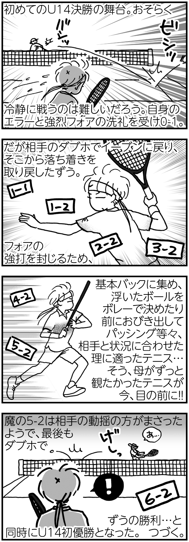 鍋は煮えたか〈起句〉【テニ厨/Game.530】 2024年04月12日 カテゴリ:試合中学生・部活時代〈一年〉 久しぶりのテニスネタ…てかテニス漫画を描いていたはずなのだが笑中体連は無観客試合が続く中、久しぶりにずうの試合を観る機会を得た。練習すらほとんど観ていないのでどのくらい成長したのか、どんなテニスをするのかとついついワクついてしまう。しかしテニスは相手がいるスポーツ、過度な期待は禁物である。(。-人-。)ところでこのウェア、お気づきだろうか。そう、はなちゃんからいただいた8歳のお誕生日プレゼントである。まさかこんなに永く着られるとは…!↓ タグ :#試合#フェデラー